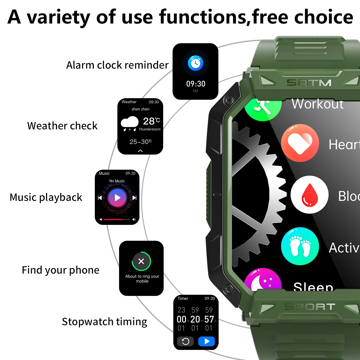 | function | Accelerometer, Answer Call, Breath Monitor, Calculators, Calendar, Call Reminder, Calorie Tracker, Countdown, Dial Call, Distance Tracker, Fitness Tracker, Gesture Control, Heart Rate Tracker, Menstrual Management, Message Reminder, Moisture Measurement, Music Player, Noctilucent, Passometer, Payment, Prayer reminder, Push Message, Remote Control, Sedentary Reminder, Sleep Tracker, Speed Measurement, THERMOMETER, chronograph |